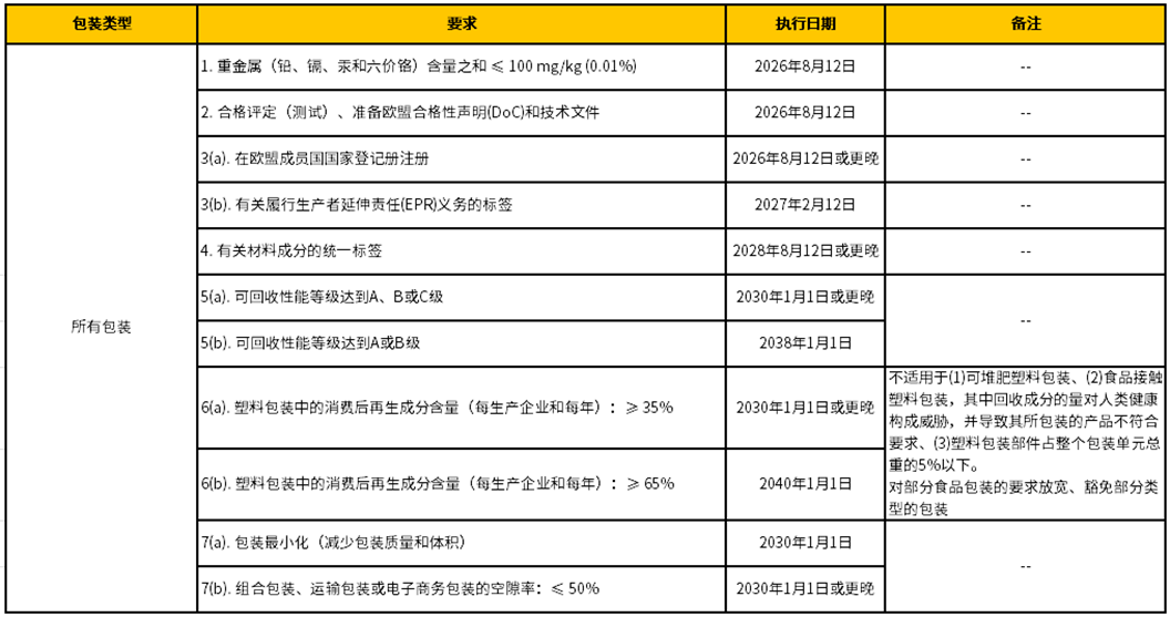 2025年2月11日生效!歐盟發(fā)布包裝和包裝廢棄物法規(PPWR)歐盟議會(huì )和理事會(huì )于2024 年12月19日通過(guò)了《包裝和包裝廢物法規(EU) 2025/40 》(簡(jiǎn)稱(chēng)“PPWR”),該法規于2025年1月22日正式發(fā)布,2025年2月11日生效。新規將全面禁止在食品接觸材料中使用PFAS并對包裝材料中回收材料含量設定了嚴格的標準?! PWR 列出了截至 2040 年的關(guān)鍵日期和期限?! 〉?2025 年 12 月 31 日: 1. 歐盟成員國要實(shí)現所有包裝廢棄物的65%的回收率(按重量計算),具體材料的目標如下:木材25%;鋁或塑料50%;黑色金屬或玻璃70%;紙和紙板75%?! ?. 歐盟成員國必須向歐盟委員會(huì )和歐洲化學(xué)品管理局提交有關(guān)對包裝材料的再利用和回收產(chǎn)生負面影響的任何物質(zhì)的信息?! ?. 歐盟成員國可以選擇使用默認年份 2018 年以外的基準年來(lái)實(shí)現減少人均包裝垃圾的目標?! ∫韵率菤W盟PPWR法規對歐盟普通包裝的制造商和進(jìn)口商的基本技術(shù)要求: PPWR 關(guān)于可持續包裝的主要內容: 包裝減量目標:要求到 2030 年減少 5% 的包裝使用量,到 2035 年減少 10%,到 2040 年減少 15%?! “b可回收性要求:除輕質(zhì)木材、軟木等材料外,所有包裝材料都必須滿(mǎn)足嚴格的可回收性標準。到2030年,所有包裝必須是可回收的,并且提出了可回收性評級標準:A-C,A是95%,B是80%,C是70%,低于70%將被禁止?! ∷芰习b回收目標和再生材料含量目標:PPWR要求到2025年,塑料包裝回收率達到50%;到2030,回收率達到55%,并且對不同塑料包裝應用提出了再生含量強制目標。到 2040 年,一次性塑料飲料瓶的再生材料含量需達到 65%,PET 接觸敏感包裝需達到 50%,其他包裝需達到 65%?! ∫淮涡运芰巷嬃先萜鞯幕厥漳繕耍旱?2029 年,90% 的一次性塑料和金屬飲料容器(容量不超過(guò)三升)需通過(guò)押金返還系統或其他有效方式單獨回收?! 撕?、標識和信息要求:要求包裝標明材料成分或回收含量,幫助消費者分類(lèi)和選擇?! ∠拗埔淮涡运芰习b:限制對 1.5 千克以下的水果和蔬菜進(jìn)行預包裝、酒店等場(chǎng)所內提供的灌裝和消費類(lèi)食物和飲料等多種一次性塑料包裝的使用?! ≡倮媚繕撕椭貜吞钛b義務(wù):設定了 2030 年強制性再利用目標,運輸和銷(xiāo)售包裝的強制性再利用目標為 40%,組合包裝的目標為 10%。外賣(mài)商家必須為顧客提供自帶容器的選擇??偨Y 《歐盟包裝與包裝廢棄物法規》(PPWR)是歐盟為應對包裝廢棄物問(wèn)題而采取的全面措施,旨在通過(guò)嚴格的可持續性要求、回收目標和市場(chǎng)監督機制,推動(dòng)包裝行業(yè)向循環(huán)經(jīng)濟轉型。這一法規的實(shí)施將對全球包裝行業(yè)產(chǎn)生深遠影響,推動(dòng)企業(yè)采用更環(huán)保的包裝解決方案,減少對環(huán)境的負面影響。來(lái)源:中塑在線(xiàn)(R-11) 2025-02-13 【節能環(huán)?!?/div>